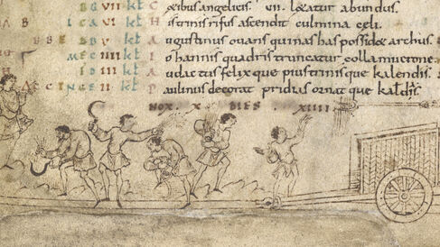 The Julius Calendar and Hymnal, calendar page for August: farm workers harvesting corn. Courtesy British Library, Cotton Julius A. VI, f.6v