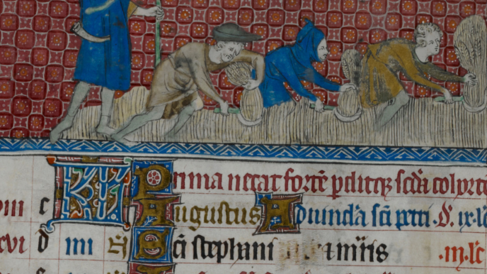 Queen Mary Psalter, calendar scene for August showing three men reaping, with a farmer directing them. Courtesy British Library, Royal 2 B. VII, f.78v